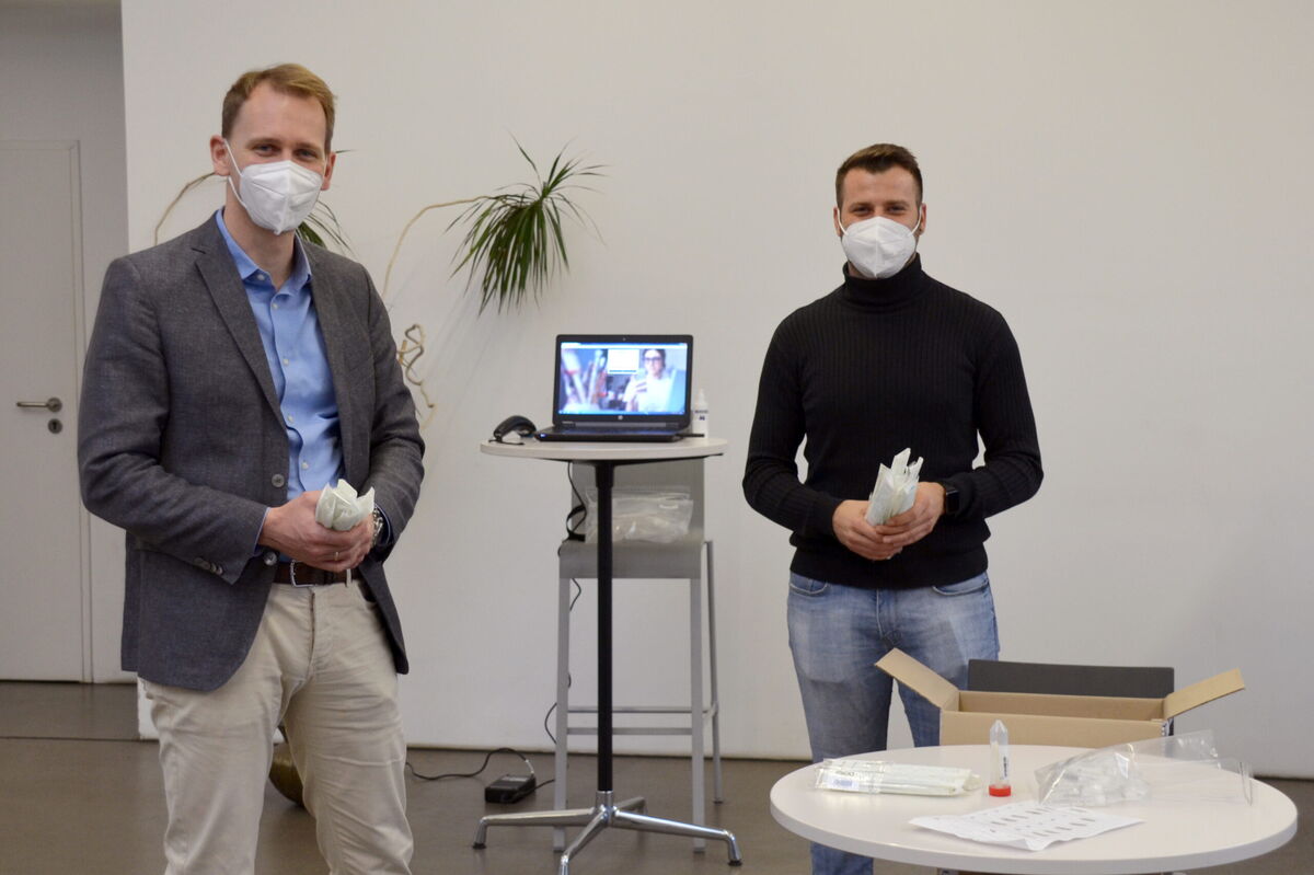 Zum Foto (c) PASCHAL: Dr.-Ing., Dr. rer. pol. Marius Wunder (links) und Alex Buchmiller von der PASCHAL-Werk G.Maier GmbH nutzen mit CoviSecure ein strategisches Verfahren, um das Risiko eines Infektionsausbruchs von Covid19 zu minimieren.