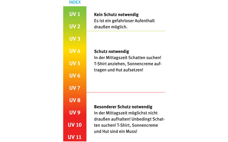 Je stärker die UV-Strahlen desto mehr Vorsicht ist geboten. Wie stark die aktuelle Belastung ist, kann beim Bundesamt für Strahlenschutz aber auch auf dem Smartphone einfach überprüft werden. Je nach aktuellem Index, steigt das Risiko eines Sonnenbrandes. Zu viel Sonne kann die Haut schädigen und Hautkrebs verursachen. Dementsprechend ist folgendes zu beachten, siehe Abbildung (Deutsche Krebshilfe 2016).